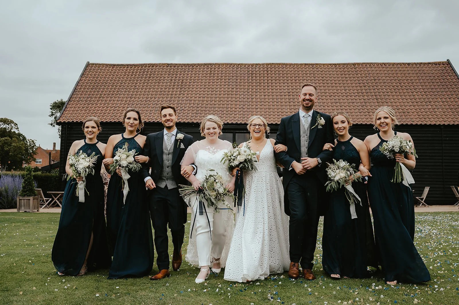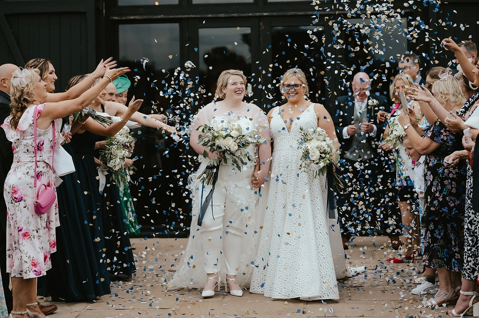 Confetti throwing for the new Mrs & Mrs on the barn front lawn