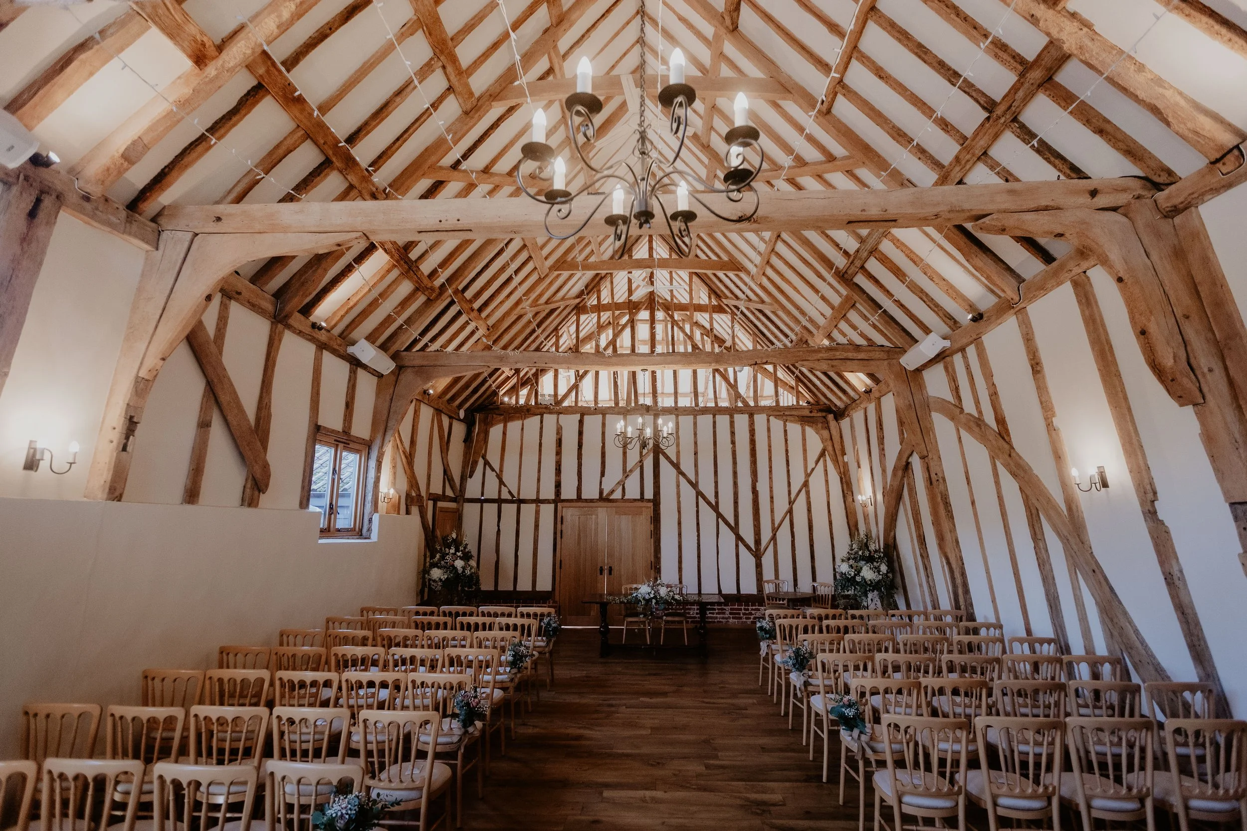 The barn’s Banqueting Hall perfectly decorated ready for E & A’s wedding breakfast