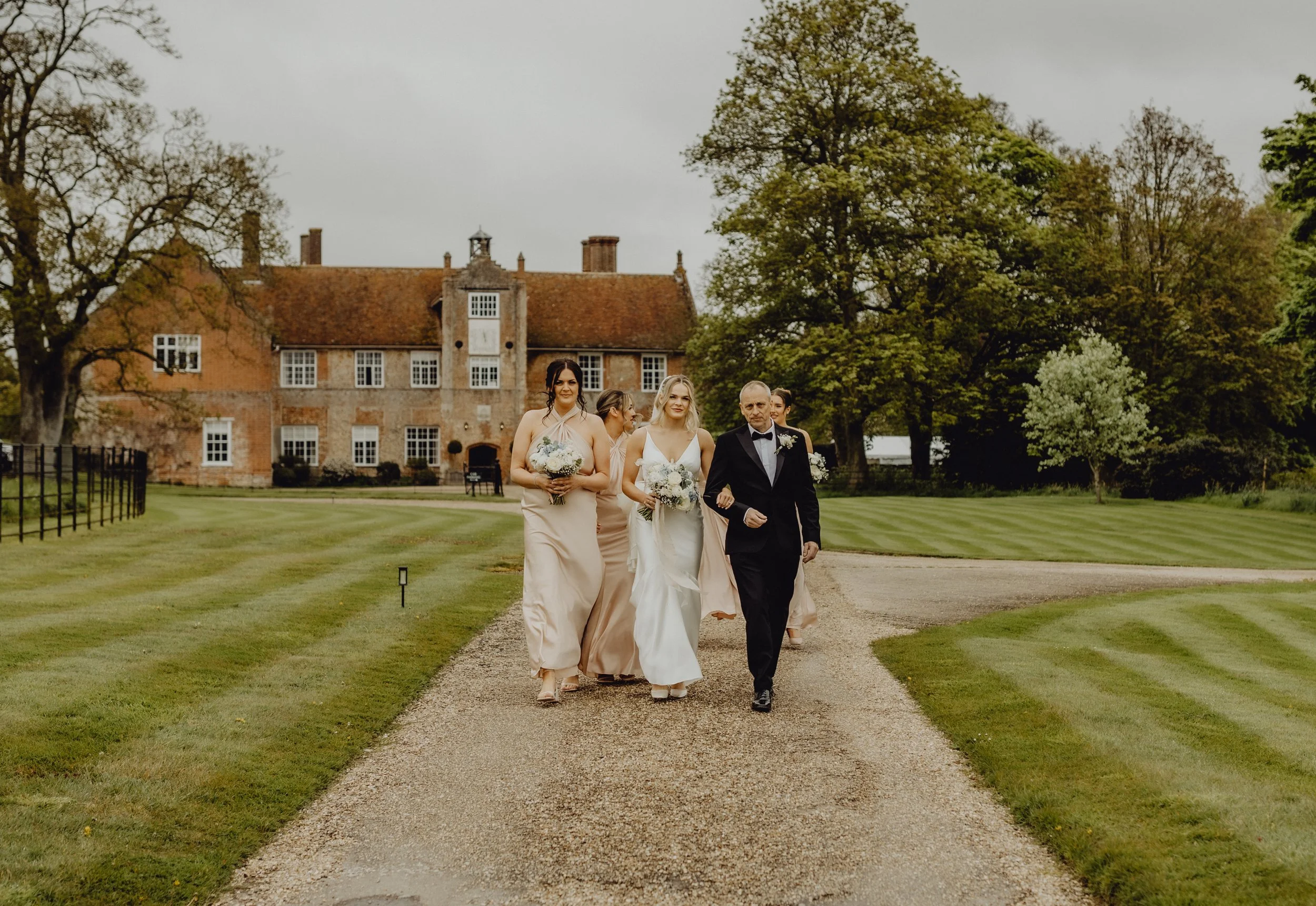 H & her bridal party making their way to Bruisyard Barn
